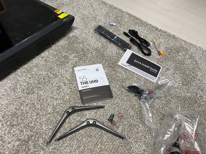 스탠드 다리 좌우 2개랑 설명서, 리모컨, 케이블 등등