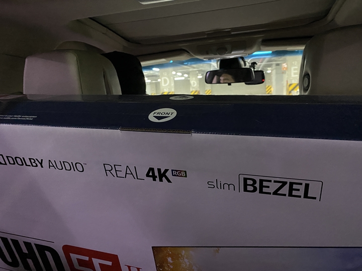 뒷자리에 가득 찬 55인치 스마트 티비모습입니다