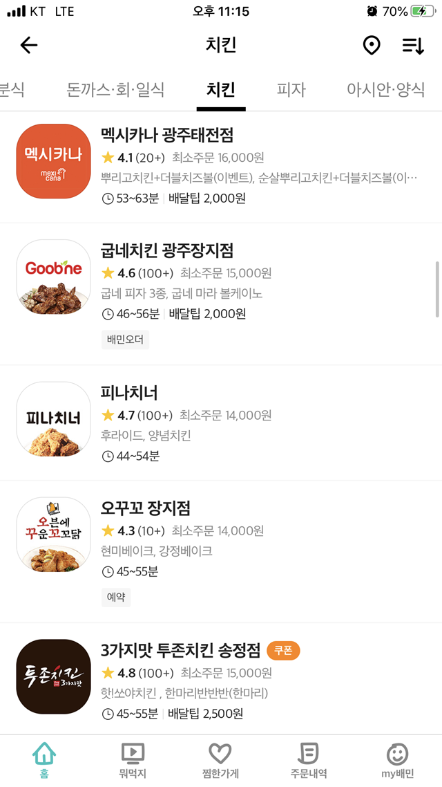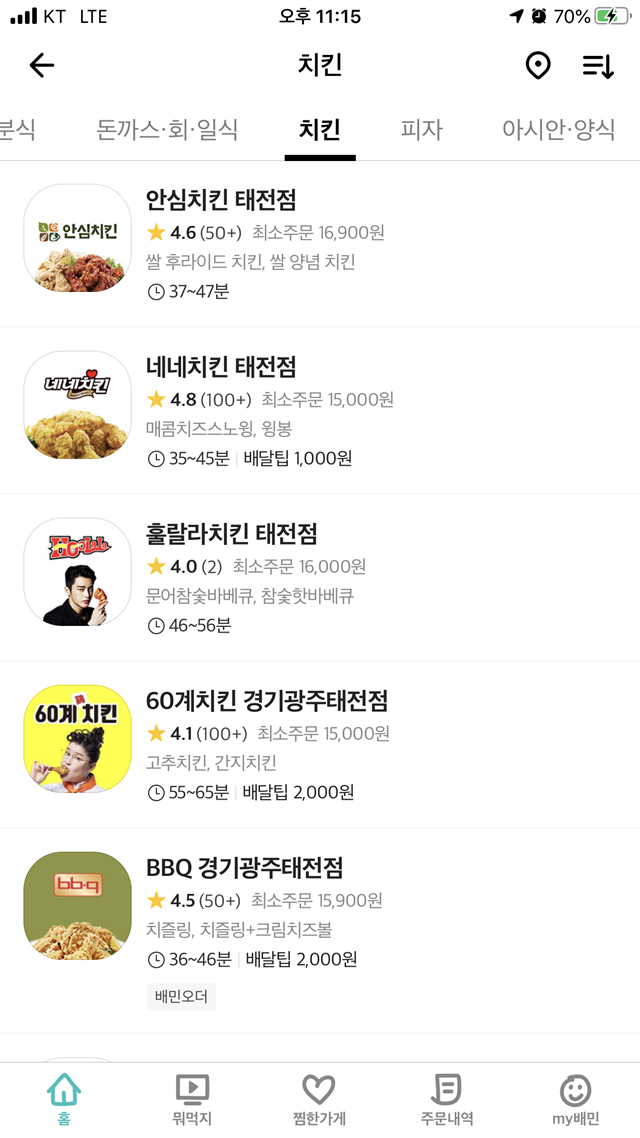 제가 사는 곳으로 배달 가능한 치킨집을 보니