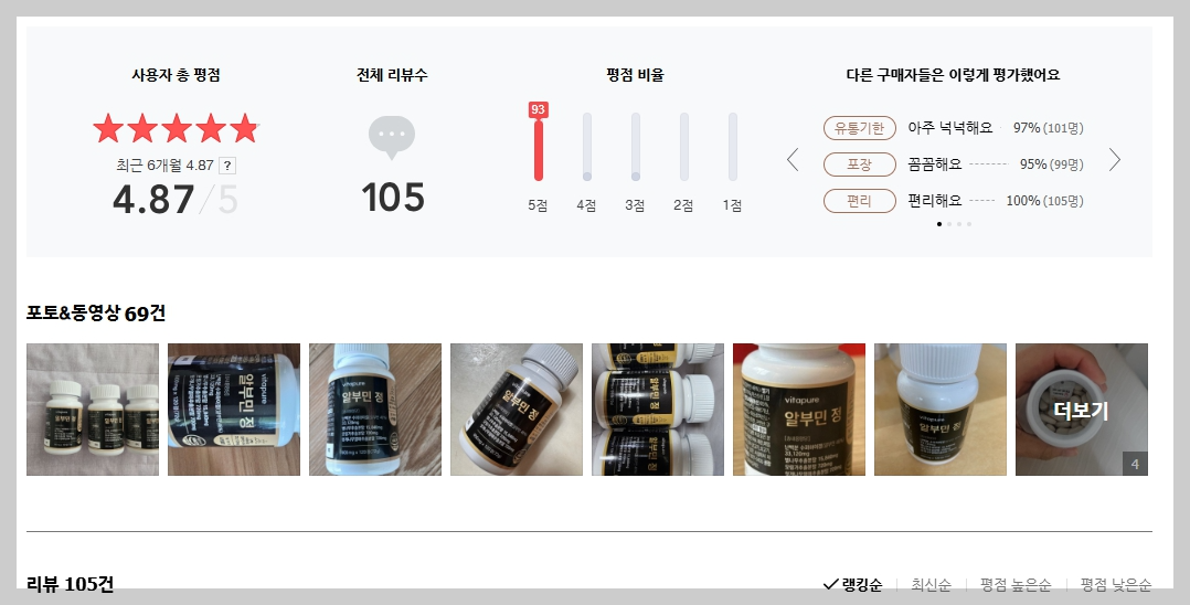 40대 이후 건강 관리는 단백질 관리에서 시작된다고 해도 과언이 아닙니다. 알부민은 단백질의 핵심으로, 우리 몸의 여러 기능을 지탱하는 중요한 역할을 합니다. 바쁜 일상 속에서도 꾸준한 알부민 보충을 통해 활력 넘치는 중년 이후의 삶을 준비해 보시기 바랍니다. 비타퓨어 알부민은 출시 후 1차 생산량이 빠르게 완판 되고 네이버 스마트스토어 구매 후기가 105건이 넘어가고 있습니다.