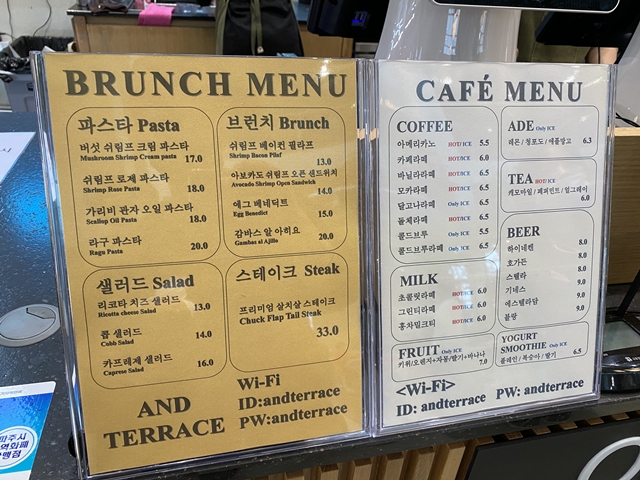파주 앤드테라스 브렌치 메뉴와 카페 메뉴입니다
